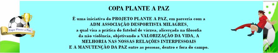 | Assim como a Copa Plante a Paz de futebol de campo, também podemos utilizar a mesma metodologia em outras atividades esportivas, por isso nós temos no layout da Copa Plante a Paz a seguinte mensagem: PROMOVENDO A VIDA E A PAZ EM NOSSAS AÇÕES ESPORTIVAS. | |||||||